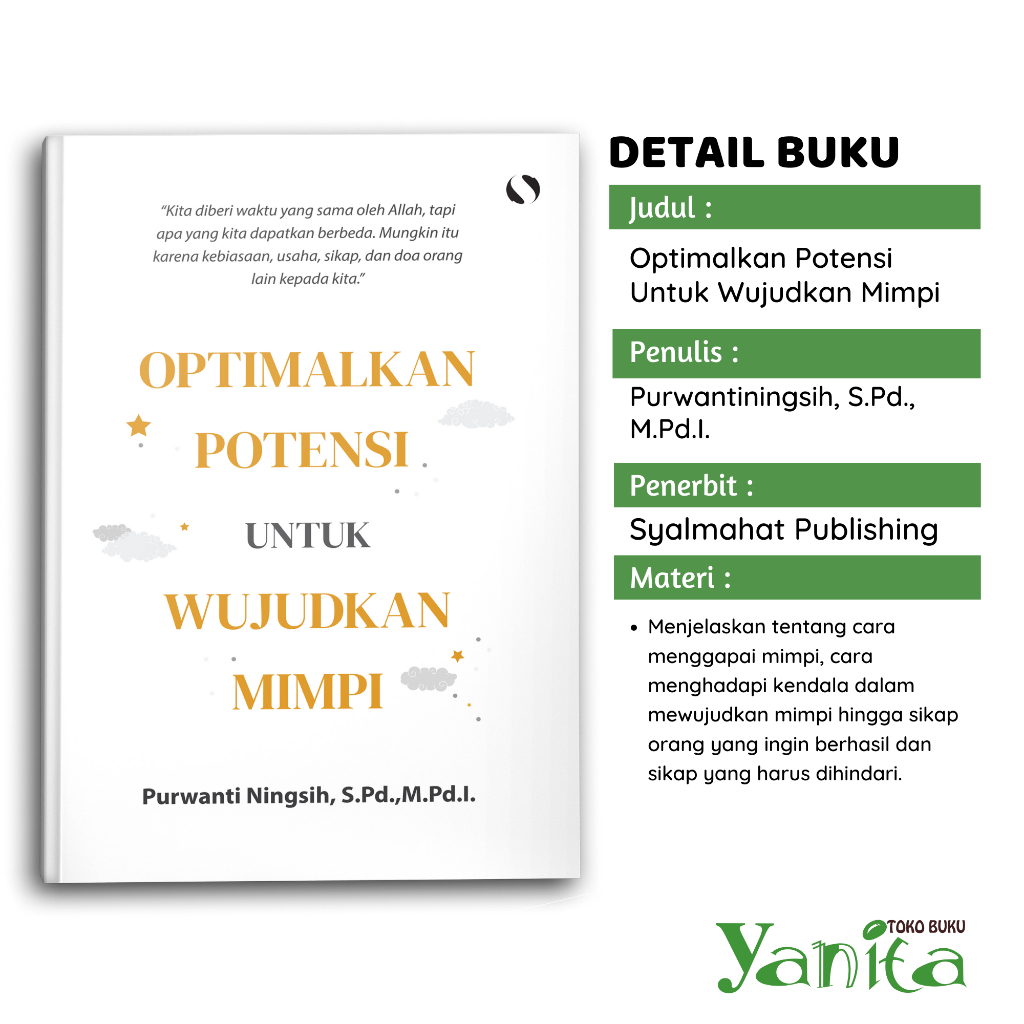 Buku Optimalkan Potensi Untuk Wujudkan Mimpi menjelaskan tentang cara menggapai mimpi, cara menghadapi kendala dalam mewujudkan mimpi hingga sikap orang yang ingin berhasil dan sikap yang harus dihindari.