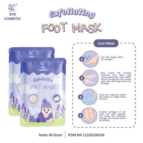 - SYB Cosmetic Exfoliating Foot Mask Masker kaki yang mempunyai fungsi kegunaan untuk melembapkan dan membantu eksfoliasi atau pelepasan kulit luar sehingga kulit kaki lebih halus Cara Pakai : 1. Cuci kaki hingga bersih dan keringkan 2. Pakai masker SYB Cosmetic Exfoliating Foot Mask pada masing-masing kaki. Pakai masker selama 20 hingga 40 menit. Setelah pakai, bilas kaki hingga bersih lalu keringkan 3. Untuk hasil maksimal, rendam kaki dengan air hangat selama 10 menit. 4. Gunakan seminggu 2-3 kali untuk hasil yang maksimal. Kulit kusam akan terkelupas sehingga kulit menjadi lembut dan lembab. Unique Selling Point • Berfungsi untuk melembapkan dan membantu eksfoliasi atau pelepasan kulit luar sehingga kulit kaki lebih halus