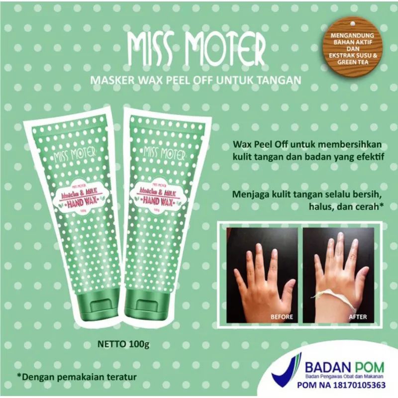 Kamu malas buat luluran atau scrubbing? Produk ini cocok buat kamu, pakai MIss Moter Matcha. Tinggal oles, tunggu sampai kering, lalu dikelupas, simple kan?. Aman untuk busui atau bumil dan aman untuk kulit sensitif sekalipun. Isi gel super kental, jadi kalau mengering bisa dikelupas seperti sarung tangan karet.