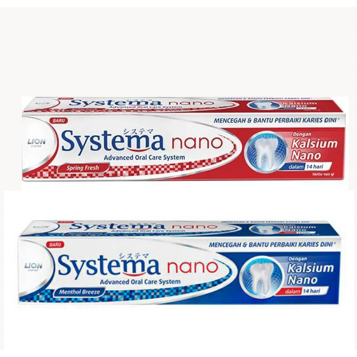 .Systema Toothpaste Menthol Breeze merupakan pasta gigi yang memiliki teknologi Nano Calcium yang memiliki khasiat untuk menutup lubang Nano super kecil selama 14 hari dan teknologi Fast Action System yang membuat pasta gigi Systema Toothpaste Menthol Breeze cepat lumer dan menyebar di dalam mulut anda. . Systema Spring Fresh Pasta Gigi [190 g] merupakan pasta gigi dengan teknologi Nano Calcium pertama di Indonesia yang mampu menutup lubang nano super kecil selama 14 hari. Dengan Fast Action System sehingga pasta cepat lumer dan cepat menyebar di dalam mulut sehingga memberikan perlindungan maskimal pada mulut Anda.