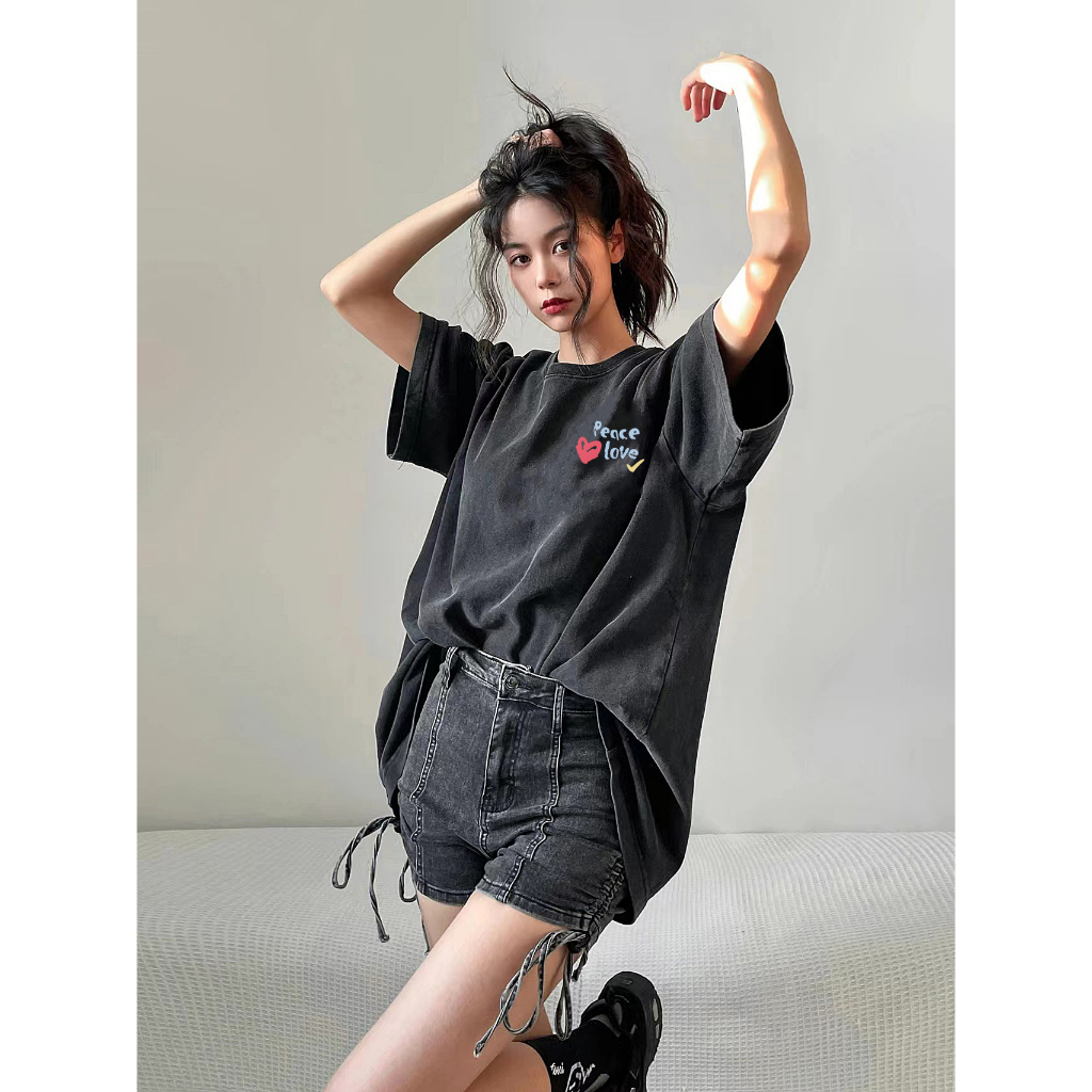 Detail t shirt Hitam washed baju wanita kaos wanita kaos oversize atasan wanita t shirt Letter lengan pendek kaos pakaian