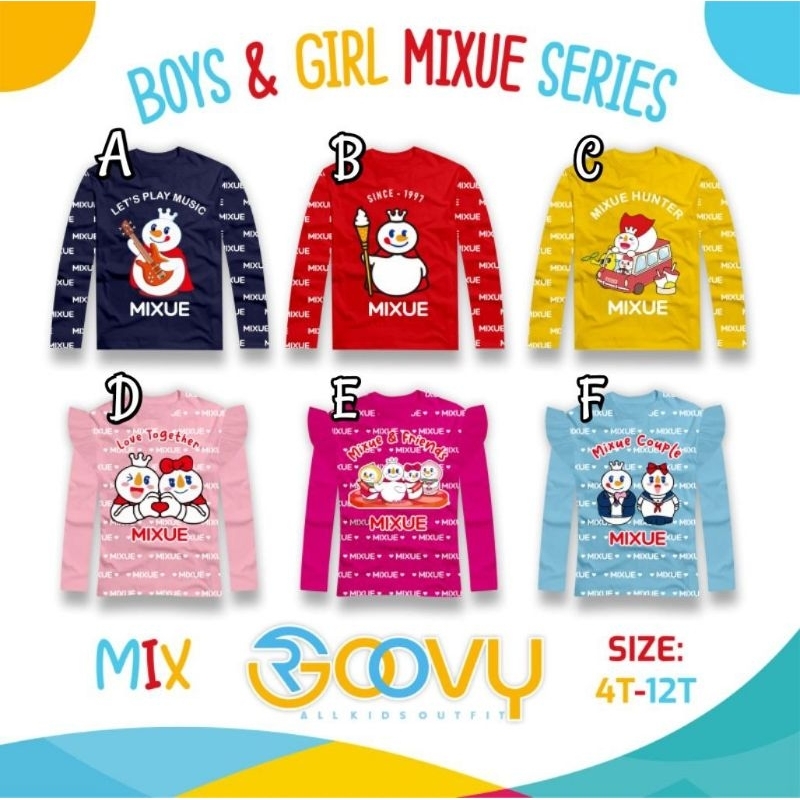 Kaos Anak Boy & Girl Tangan Panjang Yang Bertemakan *MIXUE SERIES* yang cute dengan warna yang menarik juga, kualitas bahan premiun, Trendy dan tentunya nyaman dan aman di pakai 🌻
