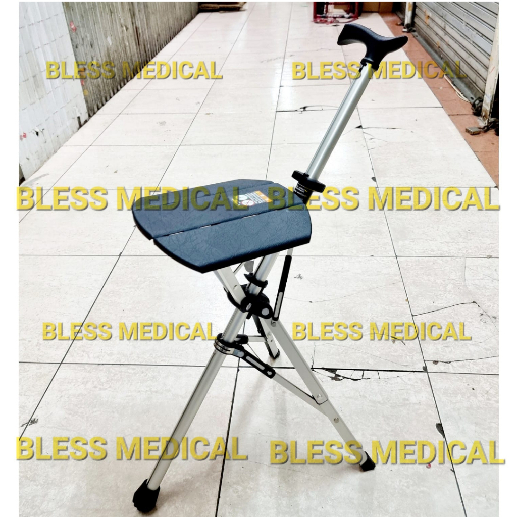 Tongkat Multifungsi - Tongkat Jalan & Tempat Duduk adalah tongkat yang dapat difungsikan sebagai alat penyangga tambahan berjalan untuk memudahkan orang tua saat berjalan. Tetapi tentunya tidak tongkat ini tidak hanya untuk memudahkan orang tua, tetapi dapat juga digunakan oleh semua orang untuk perjalanan jauh, agar bisa istirahat dimana saja. Tongkat ini memiliki penyangga yang kuat dan kokoh untuk menopang tubuh si pemakai. Dapat juga difungsikan sebagai kursi portabel saat diperlukan. Pada kaki-kakinya dilengkapi dengan karet anti slip untuk menghindari risiko terpeleset dan tergelincir saat sedang menggunakan tongkat pada lantai yang licin dan tidak rata.