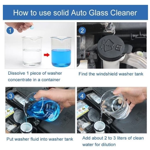 1 TABLET CUKUP CAMPURKAN 2 LITER AIR ATAU BISA LANGSUNG DIMASUKAN DALAM TABUNG AIR PEMBERSIH KACA WIPER MOBIL.