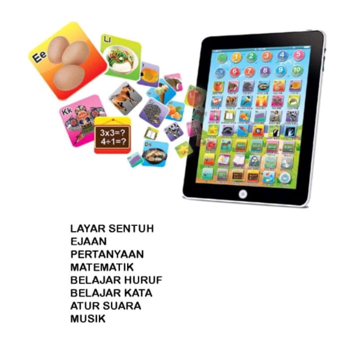 Mainan edukatif anak ini cocok sekali utk belajar calistung ( baca tulis dan hitung ) Bisa berfungsi belajar dengan mode touch screen. Fungsi: Belajar angka, huruf, spelling, mode pertanyaan (dimana angka, dimana huruf, dimana kata), melody. Ada fungsi penjumlahan dan pengurangan (misal 4+2 berapa... Bila jawaban benar akan terdengar KAMU BENAR). Ada kontrol volume dan tombol on off.