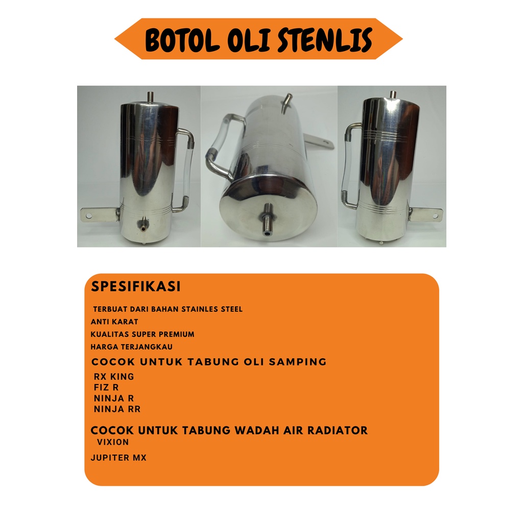 SPESIFIKASI Terbuat dari bahan stainles steel Anti karat Kualitas super premium Harga terjangkau COCOK UNTUK TABUNG OLI SAMPING -Rx King -Fiz r -Ninja R -Ninja RR COCOK UNTUK TABUNG AIR RADIATOR -Vixion -Jupiter Mx