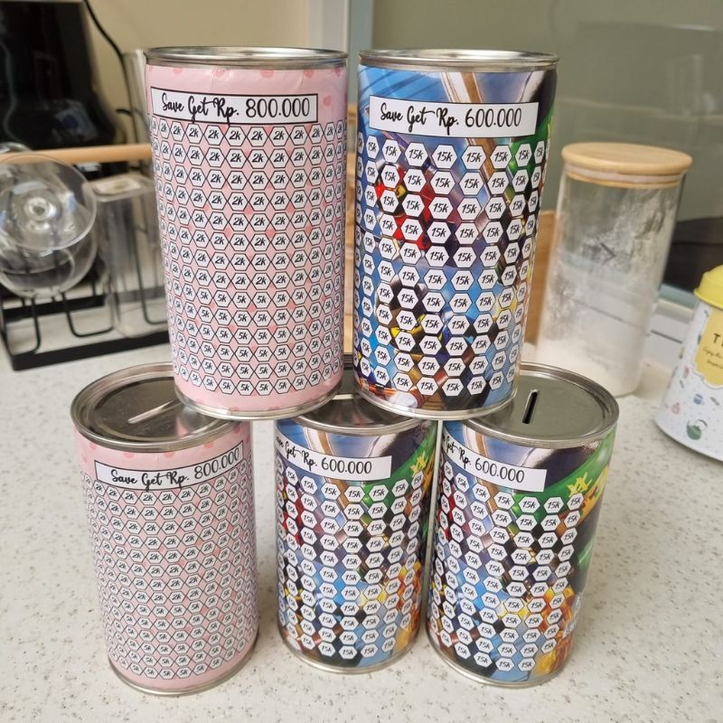 Detail Tabungan kaleng Celengan target motif & pilihan random