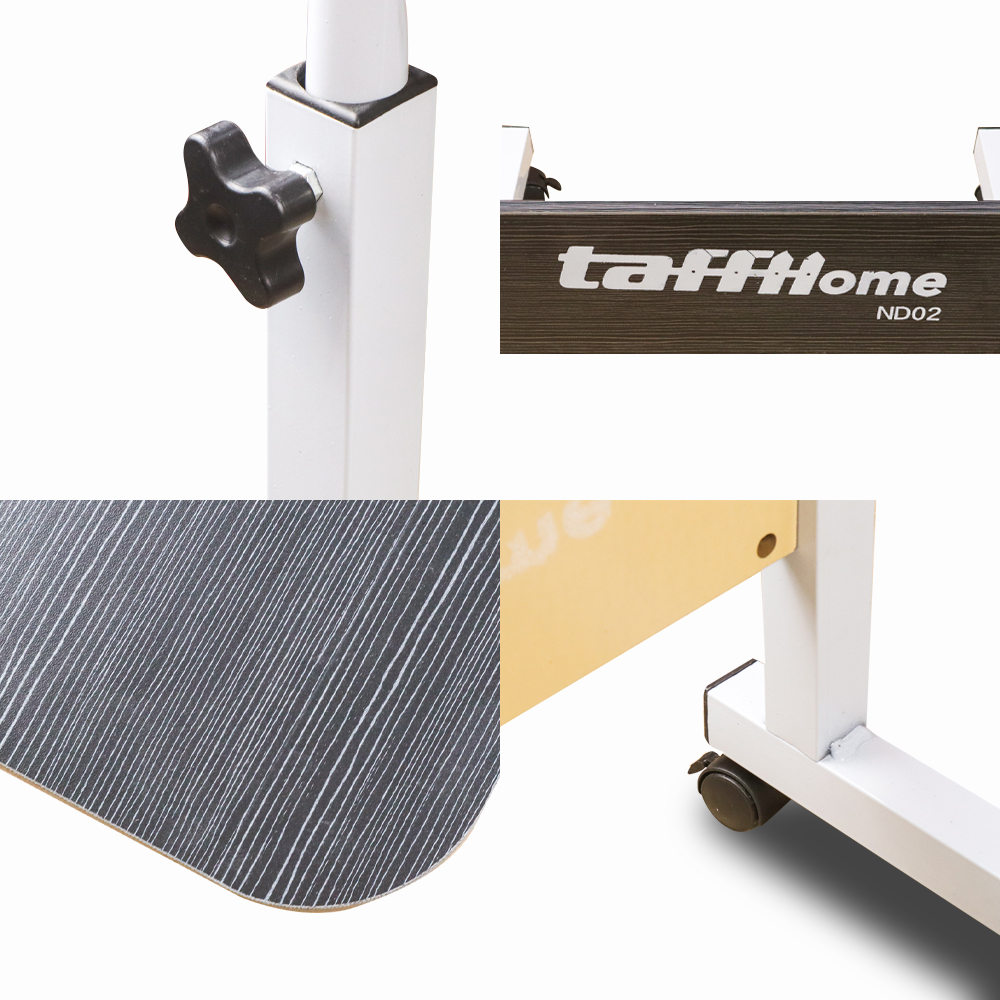 Kelengkapan Produk Rincian yang Anda dapatkan untuk pembelian produk ini: 1 x TaffHOME Meja Laptop Adjustable Portable Rotate Laptop Desk - ND02 1 Set Baut 1 x Knob 4 x Roda 1 x Kunci Pas 1 x Obeng 1 x Panduan Penggunaan
