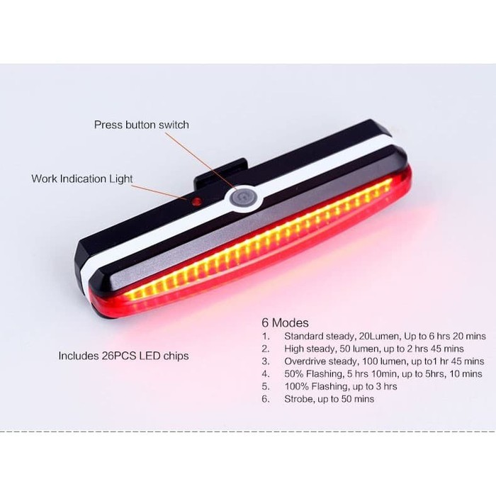 6 Mode Lampu taillight ini memiliki 6 mode lampu seperti mode standard 20 lumens, mode 50 lumens, mode 100 lumens, mode flashing berkedap-kedip, mode flashing 100% dan mode strobe.