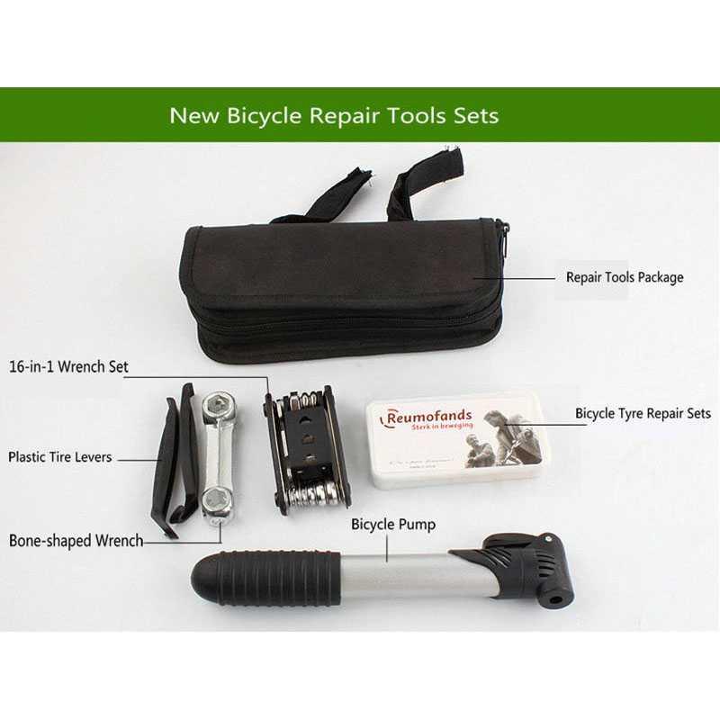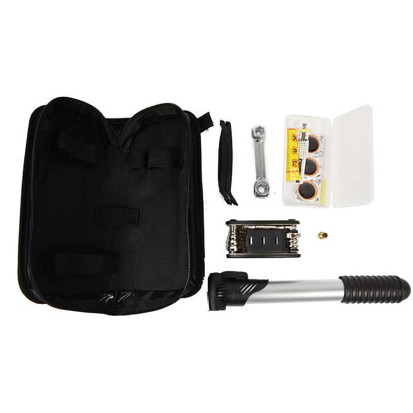 Repair Equipment Perlengkapan ini terdiri dari beberapa alat yang dapat digunakan untuk memperbaiki dan mengatasi situasi darurat untuk sepeda Anda. Terdiri dari 16 in 1 wrench set, plastic tire levers, bone shaped wrench, bicycle tire repair sets, dan juga bicycle pump yang dikemas dalam sebuah tas.