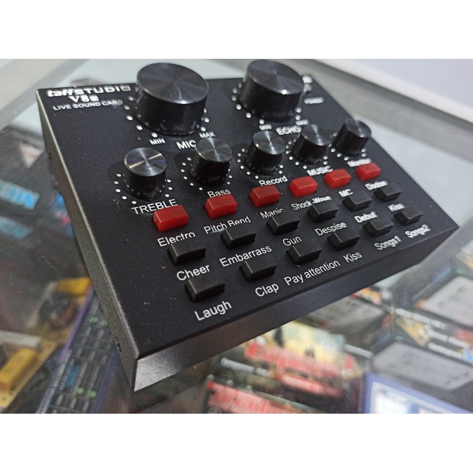 TaffStudio Bluetooth Audio USB Audio USB External Soundcard ini berguna untuk membuat efek-efek suara elektronik artifisial dan sound effect secara live dari microphone Anda. Biasa digunakan untuk broadcast dan streaming secara live diberbagai platform seperti youtube, twitch dan lainnya. Sound Card V8 Plus ini menggunakan koneksi bluetooth sehingga dapat terhubung ke komputer, laptop maupun smartphone tanpa perlu kabel lagi.