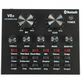Overview of TaffSTUDIO Bluetooth Audio USB External Soundcard Live Broadcast Microphone Headset - V8S Audio USB External Soundcard ini berguna untuk membuat efek-efek suara elektronik artifisial dan sound effect secara live dari microphone Anda. Biasa digunakan untuk broadcast dan streaming secara live diberbagai platform seperti youtube, twitch dan lainnya. Sound Card V8S ini menggunakan koneksi bluetooth sehingga dapat terhubung ke komputer, laptop maupun smartphone tanpa perlu kabel lagi, cocok untuk kelengkapan podcast.