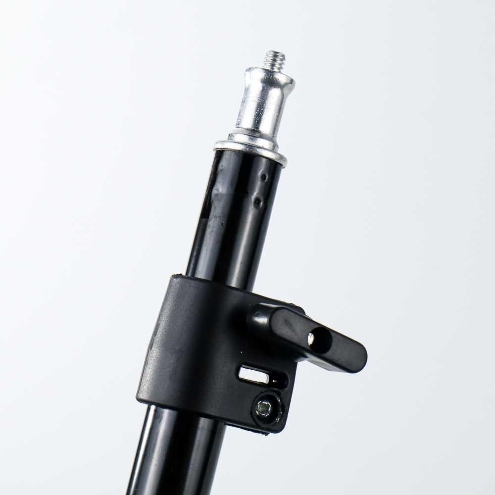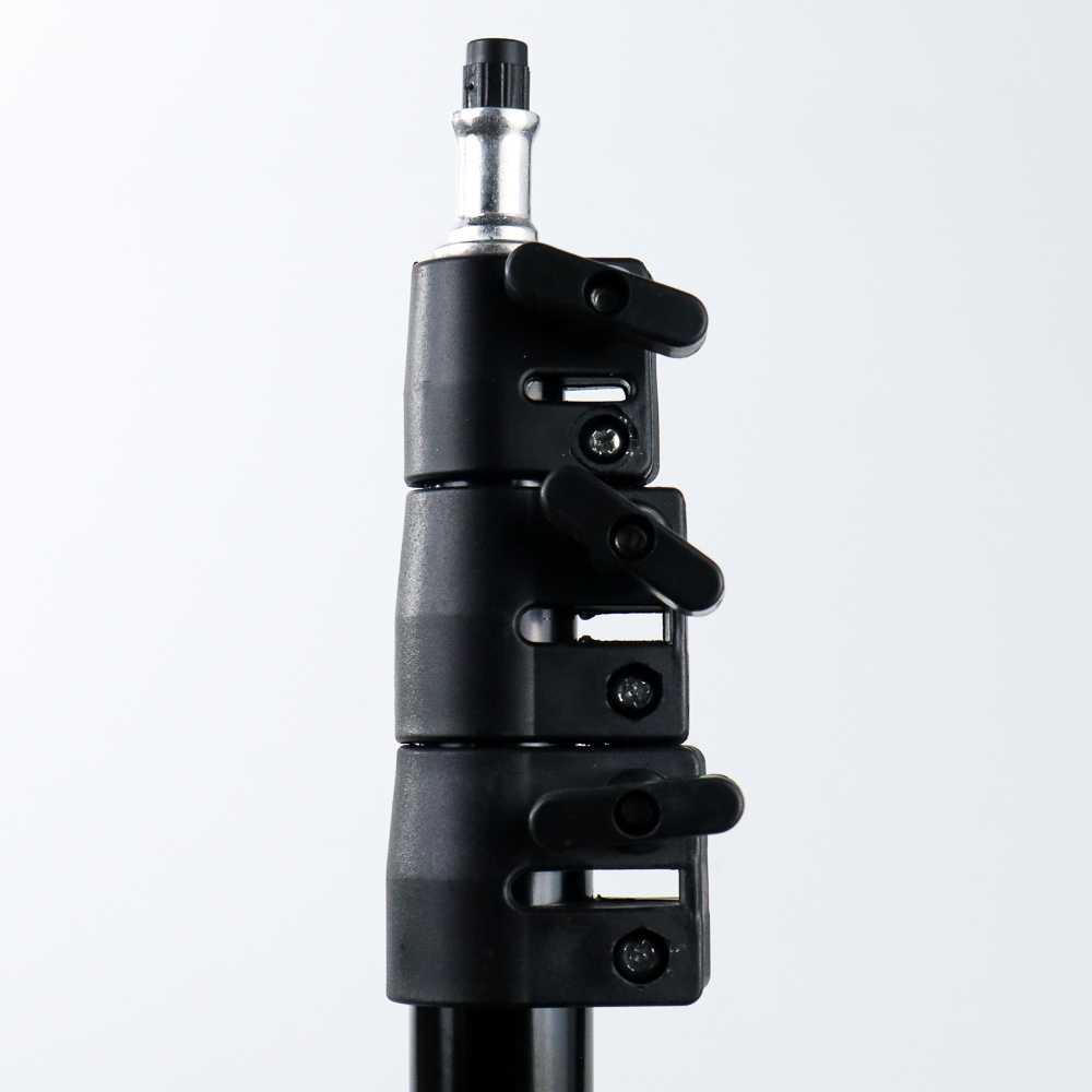 Sistem Penguncian yang Stabil Bagian kepala stan menggunakan flip lock yang berfungsi untuk mengunci tongkat saat sedang dipanjangkan, sehinggaperalatan lightning Anda akan stabil dan tidak akan jatuh.