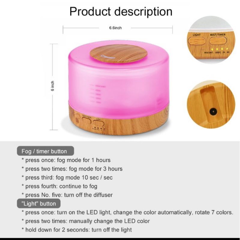 Humidifier ini hadir dengan desain yang simpel yang berfungsi untuk menjaga kelembapan udara. Anda dapat menjadikan alat ini sebagai aroma terapi dengan menambahkan minyak essensial ke dalam air. Dilengkapi lampu LED serta remot yang dapat Anda ubah warnanya sesuai dengan kebutuhan.