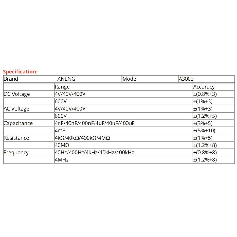 Spesifikasi Tipe Baterai 2 x AAA (Baterai Tidak Termasuk) Material ABS Dimensi 39 x 24.4 x 204 mm Panjang Kabel Tester: 119 mm Lain-lain Tegangan DC: 4 V/ 40 V/ 400 V/ 600 V Tegangan AC: 4 V/ 40 V/ 400 V/ 600 V Kapasitansi: 4 nF/ 40 nF/ 400 nF/ 4 uF/ 40 uF/ 400 uF/ 4 mF Resistansi: 4 k Ohm/ 40 k Ohm/ 400 k Ohm/ 4 M Ohm/ 40 M Ohm Frekuensi: 40 Hz/400 Hz/4 kHz/40 kHz/400 kHz/4 MHz