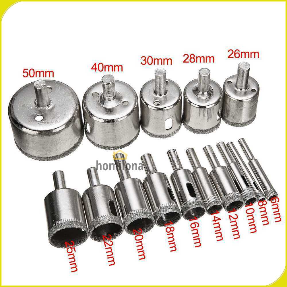 Mata bor ini terbuat dari bahan besi dan dilapisi berlian sehingga mata bor ini dapat digunakan untuk melubangi berbagai benda, seperti keramik dan kaca. Anda mendapat 15 buah mata bor dengan beberapa ukuran, yaitu 6, 8, 10, 12, 14, 16, 18, 20, 22, 25, 26, 28, 30, 40, dan 50 mm.