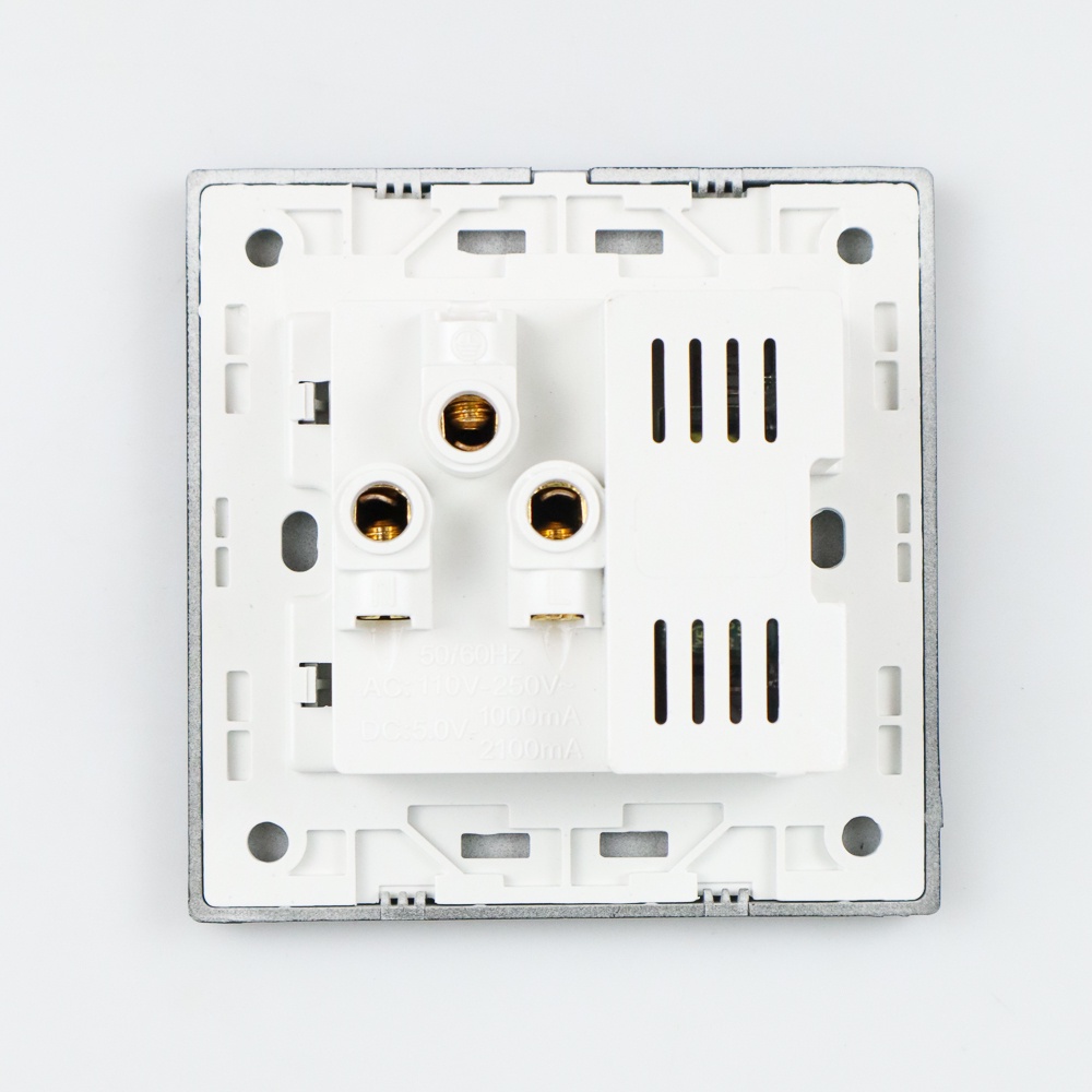 Specifications Material Flame Retardant PC Dimension 86 x 86 mm Others Electric Output: 110-250 V / 10 A USB Output: 5 V / 2.1 A Jumlah Port: 2