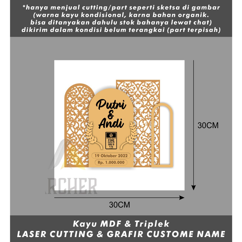 * Produk selalu ready stock * Sudah termasuk logam mulia * Lama pembuatan maksimal 2 hari * Bahan terbuat dari plywood berkualitas dan dipotong menggunakan mesin laser sehingga hasil potongan dijamin halus dan presisi * Sebelum barang dikirim akan selalu dipastikan dalam kondisi baik * Order ukuran lain bisa lewat chat