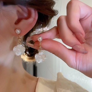 Anting Drop Desain Bunga Camellia Putih Aksen Mutiara Warna Emas Untuk Wanita