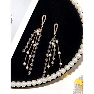 LRC Anting Tusuk Fashion Diamond And Pearl Crystal Tassel Earrings K04151