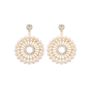LRC Anting Tusuk Fashion Golden Round Alloy Diamond And Pearl Openwork Earrings K10066