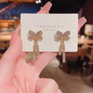 Anting Tusuk Gantung Panjang silver 925 Desain Pita Hias Kristal Berlian Untuk Wanita