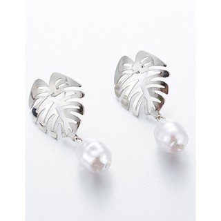 LRC Anting Tusuk Fashion Silver Alloy Openwork Leaf Pearl Earrings F91790