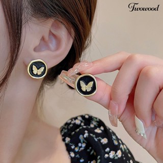 Twowood 1pasang Ear Studs Retro Gaya Perancis Menjatuhkan Minyak Tidak Teratur Bulat Hadiah Kepribadian Hitam Emas Kupu-Kupu Wanita Anting Perhiasan Fashion