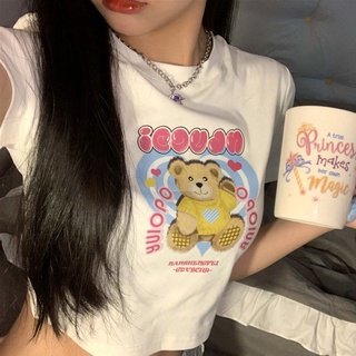 Kaos lengan pendek cetak pendek wanita musim panas gaya Amerika slim fit desain berlubang kecil atas