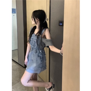 Mini Dress palsu dua potong desain suspender rok wanita musim panas tidak teratur tepi mentah denim