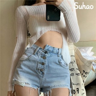 Suhao Tidak Teratur High Waist Breasted Merobek Burr Celana Pendek Denim Wanita Musim Panas Baru Ret