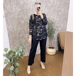 Valina Set - One Set Wanita Kemeja Rayon Premium Setelan Baju Lengan 7/8 Set Celana Panjang Kekinian LD 110 cm