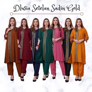 Dlusia Setelan Sadin Gold - One Set Wanita Tunik Renda Jumbo Rayon Premium Setelan Wanita Lengan Pendek Set Baju Muslim Kekinian LD 125 cm
