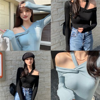 Suhao one-shoulder halter neck T-shirt wanita lengan panjang hitam seksi crop top ketat