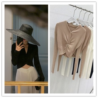 #Sisjuly# Wanita musim semi dan musim gugur baru seksi gaya busana Perancis v-neck twist tinggi elas