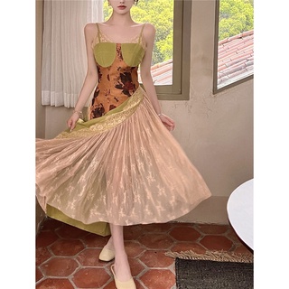 Gaun selempang wanita desain rasa ceruk renda jahitan 2022 musim panas baru ramping A-line dicetak tren rok panjang