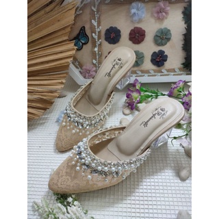 Corina Sepatu Lace Wanita Heels Crystal Kekinian Warna Cream