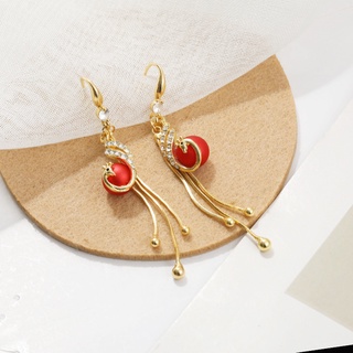 S925 perak telinga hook Korea baru super fairy Merak merah manik rumbai gaya Cina elegan sosialita P