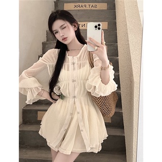 Red Pantai liburan suspender gaun wanita musim panas rajutan kardigan mantel musim semi dan musim gugur baru Perancis rok set dua potong