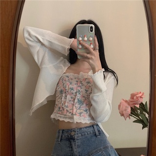 Suhao setelan dua potong wanita trendi keinginan murni ambigu ~ rompi rajutan suspender putih + blus tabir surya pendek berongga berlapis