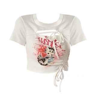 Red Gambar Solusi WAHJUIS Meow Meow Gas Desain Lengan Pendek T-shirt Wanita Musim Panas Serut Berongga Pendek Pusar Atas