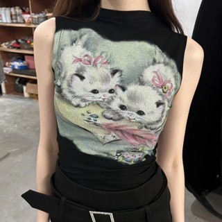 Red In Amerika ceruk musim panas lengan pendek rompi T-shirt kucing cetak kuning panas gadis slim slim stretch atasan wanita