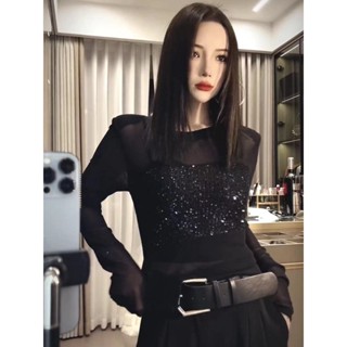 Red Fashion Eropa Industri Berat Berpayet Leher Bulat Lengan Panjang Mesh T-shirt Wanita Musim Semi Baru Temperamen Slim Slim Top