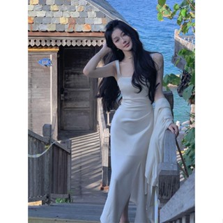 2023Gaun Satin Suspender Wanita, Gaun Ramping Setengah Panjang Prancis Musim Panas Warna Putih untuk
