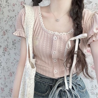 ✹❡№cropped top krim manis dan pedas girly tidak teratur renda jahitan lipatan slim fit T-shirt wanita all-match #COD