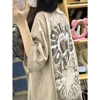 Suhao 100% katun Amerika retro lengan pendek T-shirt wanita versi Korea ins gaya Harajuku longgar mid-length pasang merek setengah lengan atas