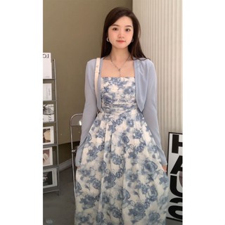 Red Tea break French blue floral dress wanita musim semi dan musim panas high-end ceruk desain rok lengan gelembung berbintang pinggang