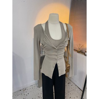 Red Temperamen high-end sense Royal Sister Fan ~ menggantung leher suspender pendek deretan tombol slim cardigan wanita musim semi dan musim gugur baru palsu dua potong