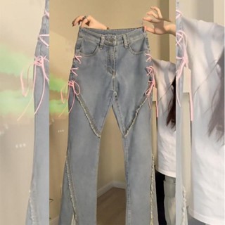 Suhao design sense slit split pants leg adjustment jeans pria dan wanita high street vibe style straight tube slim micro flared trousers