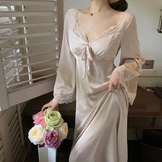 Suhao Gaun tidur ala istana Perancis Putri V-neck renda busur pergelangan kaki rok panjang peri manis elegan gaun tidur tipis